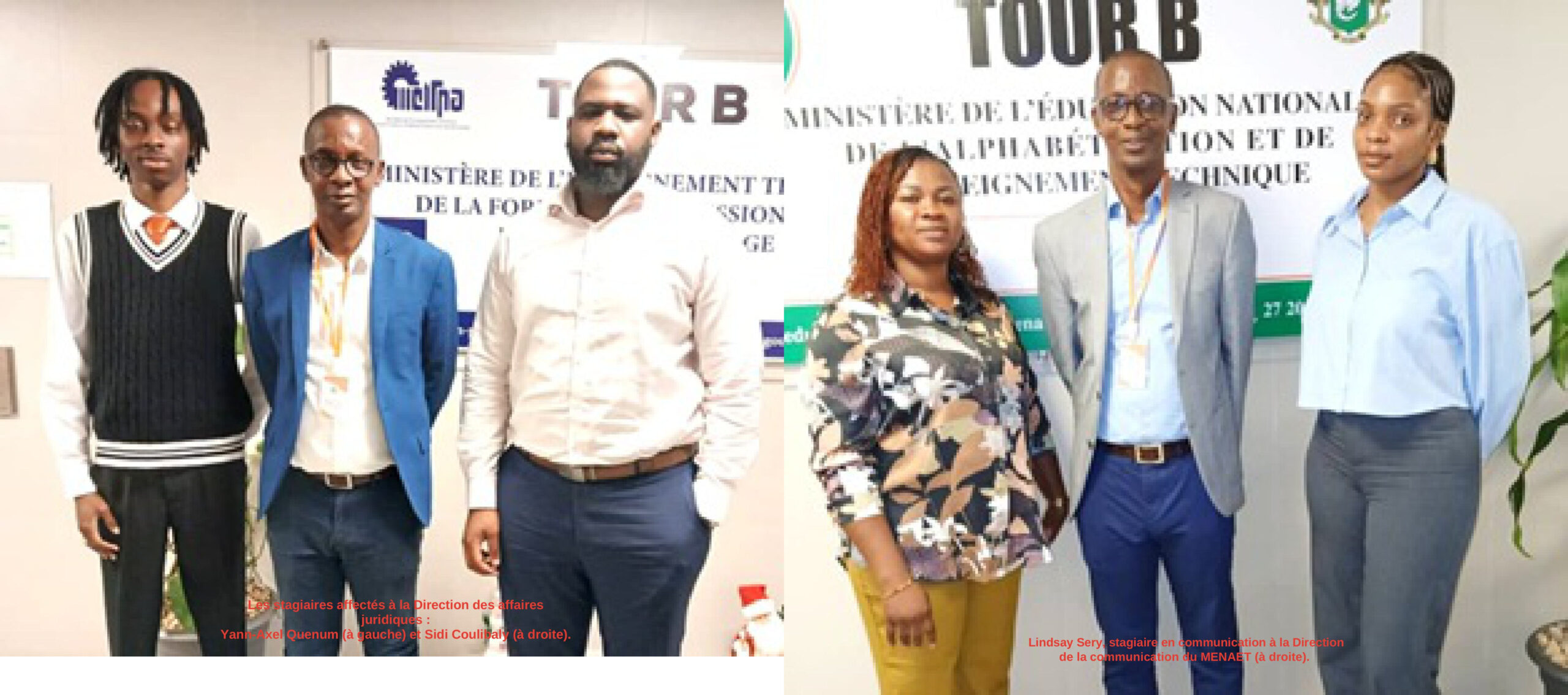 Trois (3) jeunes Canadiens, mademoiselle Lindsay Sery, messieurs Yann-Axel Quenum et Sidi Coulibaly, bénéficient d’un stage au ministère de l’Éducation nationale, de l’Alphabétisation et de l’Enseignement technique (MENAET), précisément à la direction de la Communication pour la première et à la direction des affaires juridiques pour les deux autres. Ces jeunes ont été mis en stage dans lesdites directions par l’entremise du Centre ivoirien pour le développement de la formation professionnelle, CIDFOR.